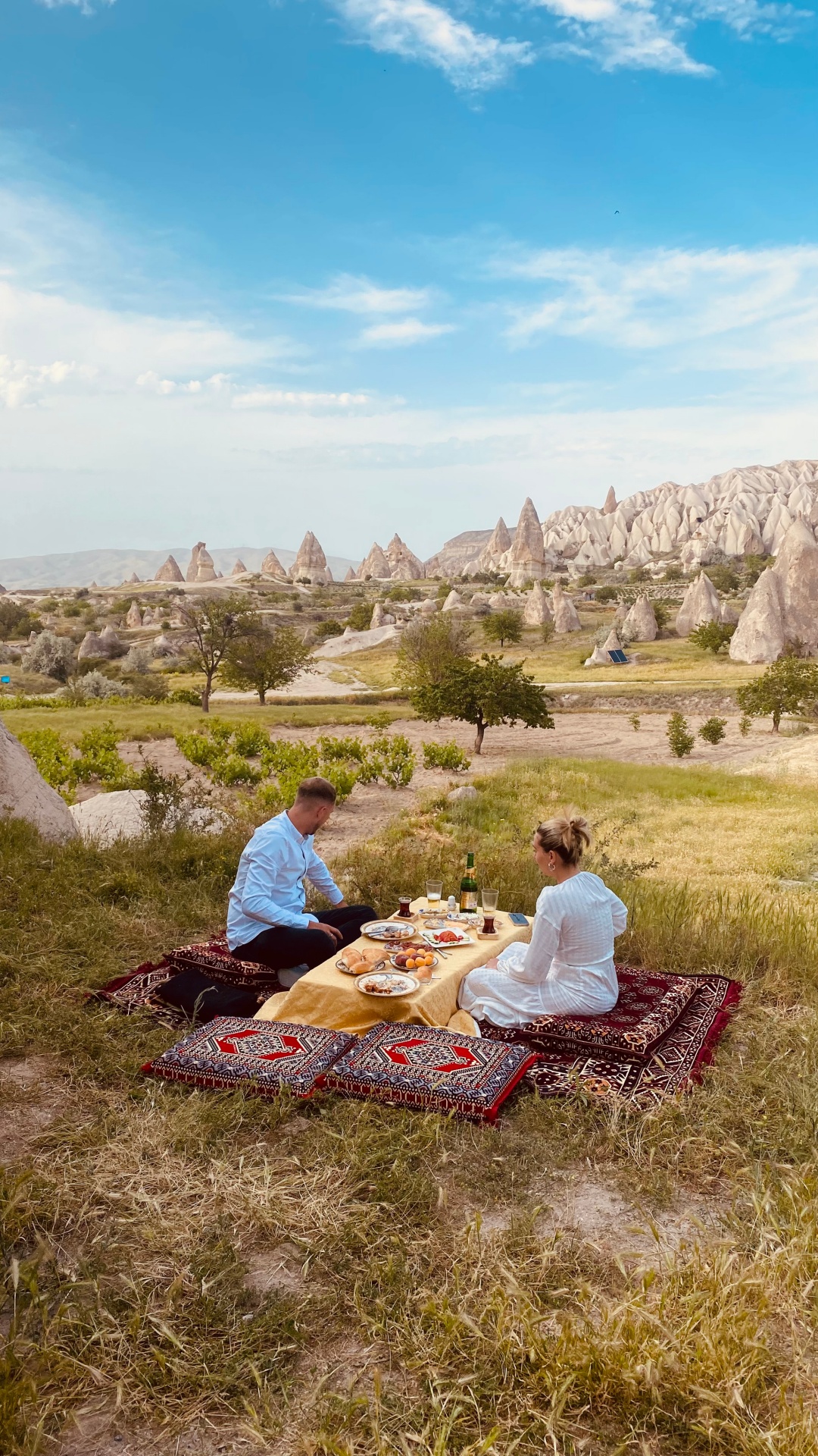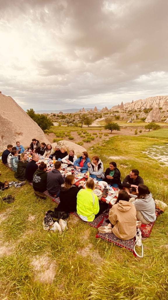 Your exclusive breakfast will be set up in a serene location surrounded by the surreal landscape of Cappadocia. You will savor a delightful meal featuring traditional Turkish flavors, including freshly baked bread, cheeses, olives, and pastries, complemented by hot tea and coffee.